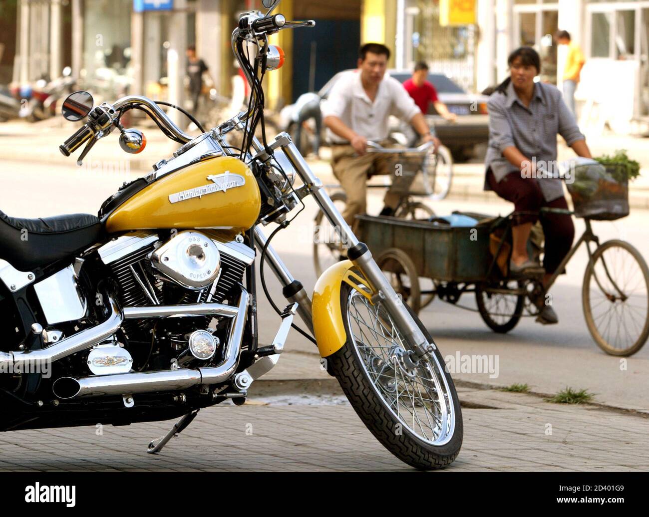 Chinese Migrant Workers Pass By A Harley Davidson Motorcycle On Display In Beijing July 21 2002 Luxury Motorcycles Have Taken Off Among The Elite Class Sprouting In China As Its Economy Transforms From